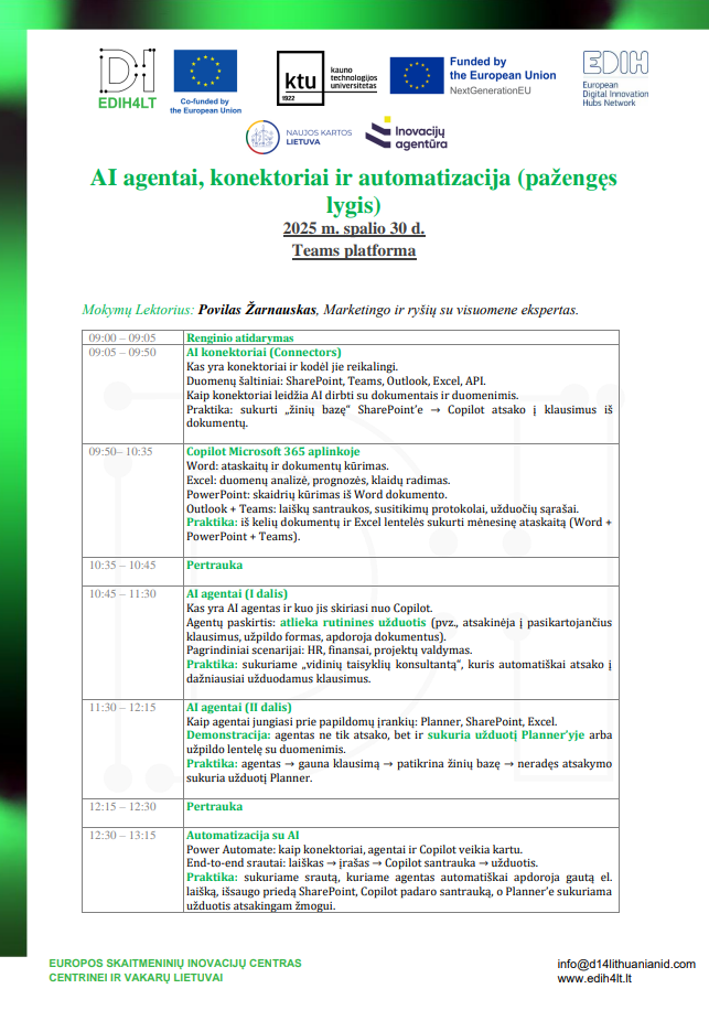 ⚙️ mokysimės kurti DI agentus, jungti juos su Microsoft 365 Copilot, naudoti konektorius (SharePoint, Teams, Excel, API) ir praktiškai įgyvendinti visą procesą – nuo laiško gavimo iki užduoties Planner’yje.