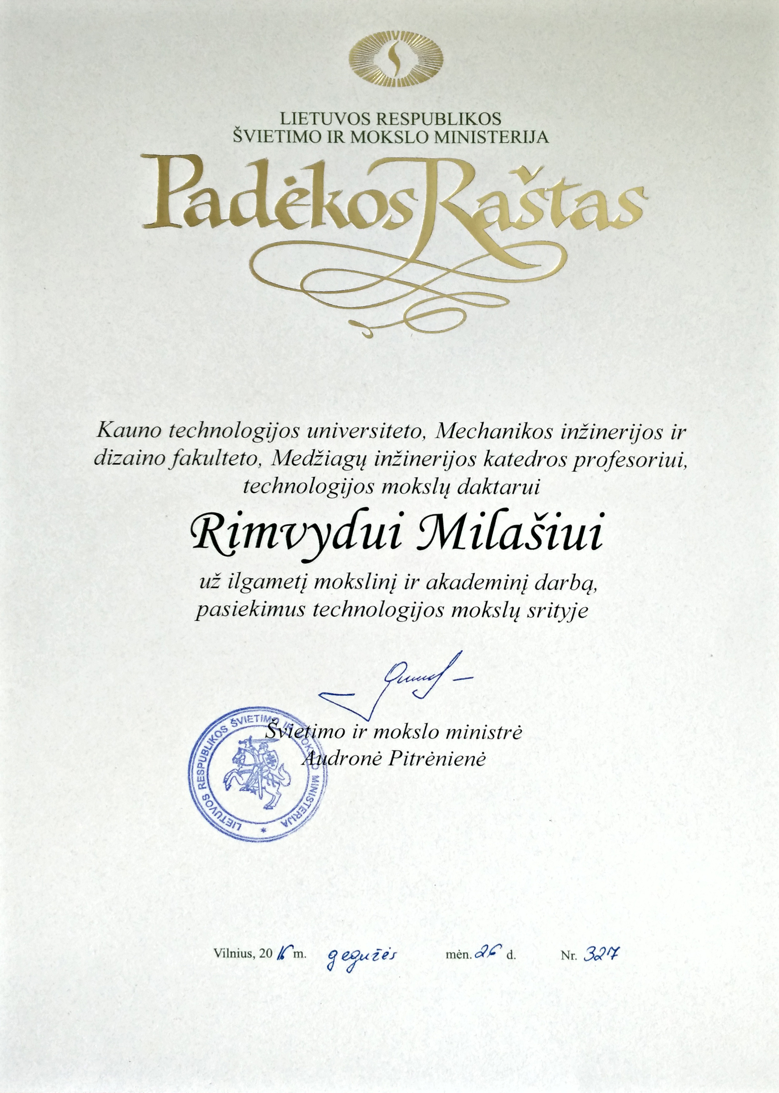 KTU Mechanikos inžinerijos ir dizaino fakulteto Medžiagų inžinerijos katedros profesoriui dr. RIMVYDUI MILAŠIUI už pasiekimus tekstilės inžinerijos moksle ir akademinį darbą įteiktas Lietuvos Respublikos Švietimo ir mokslo ministerijos Padėkos raštas.