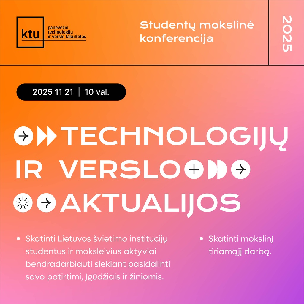 25-oji studentų mokslinė konferencija „Technologijų ir verslo aktualijos – 2025“ vyks lapkričio 21 d., KTU Panevėžio technologijų ir verslo fakultete, Nemuno g. 33, Panevėžys.